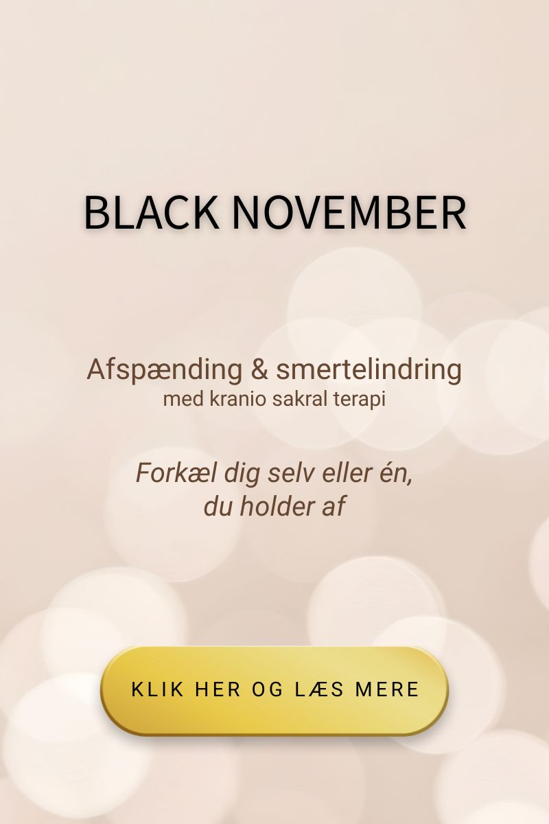 I november kan du prøve Afspænding & smertelindring med Kranio Sakral Terapi til Black November-pris – en nænsom, men dybtvirkende behandling, der hjælper kroppen med at give slip på uro og spændinger.